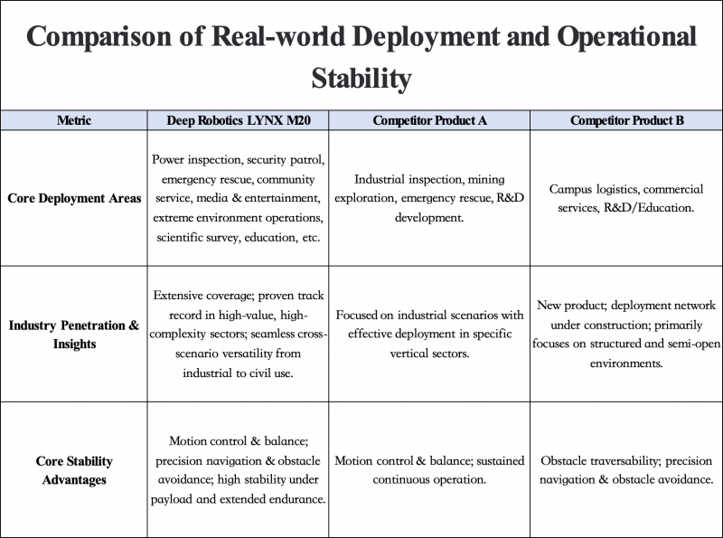 In terms of locomotion capability, the three products have comparable paper specifications. Product A excels at stair climbing. Product B leads in standard speed but is mostly limited to indoor structured scenarios. LYNX M20, however, shows no weaknesses with its "all-terrain adaptability," demonstrating robust mobility in unstructured terrains such as the soft sandy beaches of Saudi Arabia and the arched bridges of Xixi Wetland.