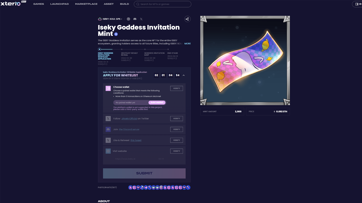 As early as January 8th, ISEKY officially announced its entry into the Xterio platform and released a teaser video for its flagship product, ISEKY: Soul GPS. The video immediately captured the hearts of Web3 users. Within just one hour, a large number of participants flooded into ISEKY's Discord channel, and their enthusiasm even triggered Discord's protective measures, prompting ISEKY to temporarily halt new user registrations. Recently, ISEKY announced that the Goddess Invitation NFT will be listed on the Xterio platform on March 21st, once again attracting the attention of WEB3 users. According to data from the Xterio website, as of the time of publication, over 1600 whitelist applications have been received, exceeding the first phase quota of 200 by 8 times.